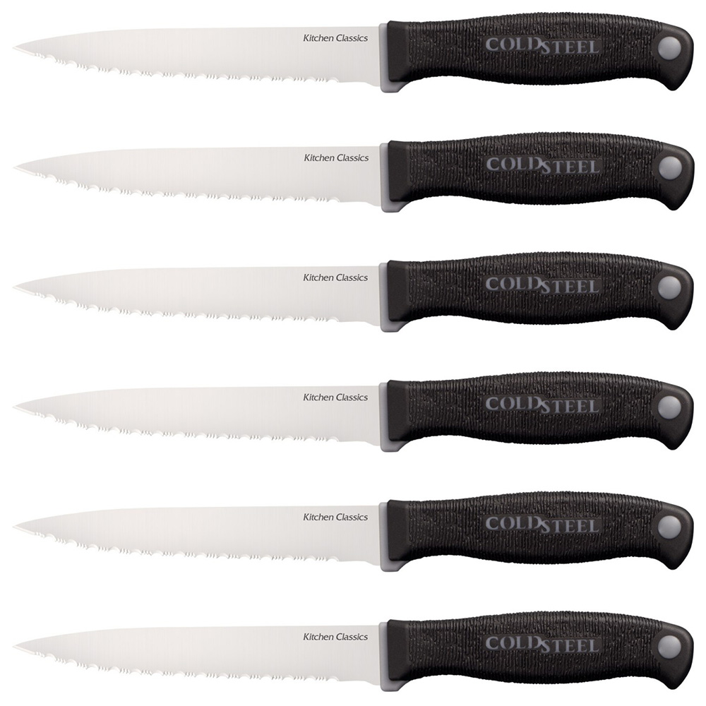 Our new series of kitchen knives, the Kitchen Classics, will race through just about any task you can imagine. These blades are ice tempered and then precision flat ground for maximum cutting power. All models in the series come with a razor sharp edge that lasts and lasts, and some have serrated edges uniquely appropriate to the tasks they were designed to do. The handles are, in a word, terrific! Carefully designed to ensure a strong, secure, yet comfortable grip, they feature a stiff Zytel core on the inside, with a softer, deeply checkered Kraton exterior for a the kind of non-slip grip that must be felt to be appreciated! The Kitchen Classics are available for purchase as single items or as a complete set. The set includes an attractive counter-top oak stand, and one of each [except for the Steak Knife, which comes in a group of 6] of the knives in the series.