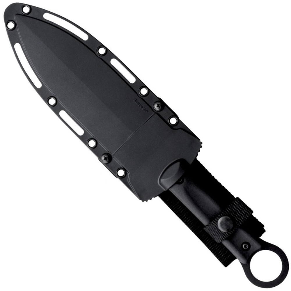 The signature ring on our Shanghai Shadow allows tremendous versatility when handling this popular and fun knife. It provides a totally secure grip when the index finger is locked in place through the hole. The wielder can also pivot the blade around the index finger for a quick change of grip, and even use the ring as a means of extending his or her reach by as much as four inches. Made from one solid piece of 1055 Carbon steel the Shanghai Shadow has a tough spring temper and twin hollow-ground edges. It is provided fully sharpened, and equipped with a heavy-duty military style Secure-Ex sheath.