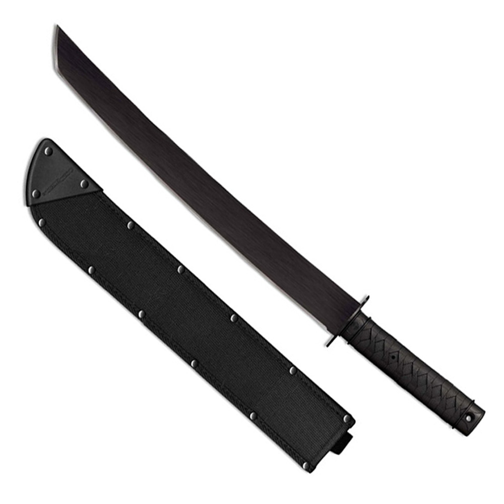 Our Tactical Series of machetes are inspired by our hugely popular and record breaking Warrior Series of Tanto, Wakizashis and Katanas. Available in 3 sizes, each of these fun and distinctive machetes features a wide, curved Tanto point blade and solid steel tsuba made from heat treated 1055 High Carbon Steel with a baked on anti-rust coating. Their broad full tangs are injection over-molded with high impact polypropylene, making them incredibly durable and weather resistant. We re-created the look of a traditional cord wrapped handle, Fuchi and Kashira but used modern materials that will not shrink, warp, tarnish or rot and require very little maintenance. Sharpened right here in our Ventura HQ, each of these Machetes comes complete with a Cor-Ex sheath for carry and storage.