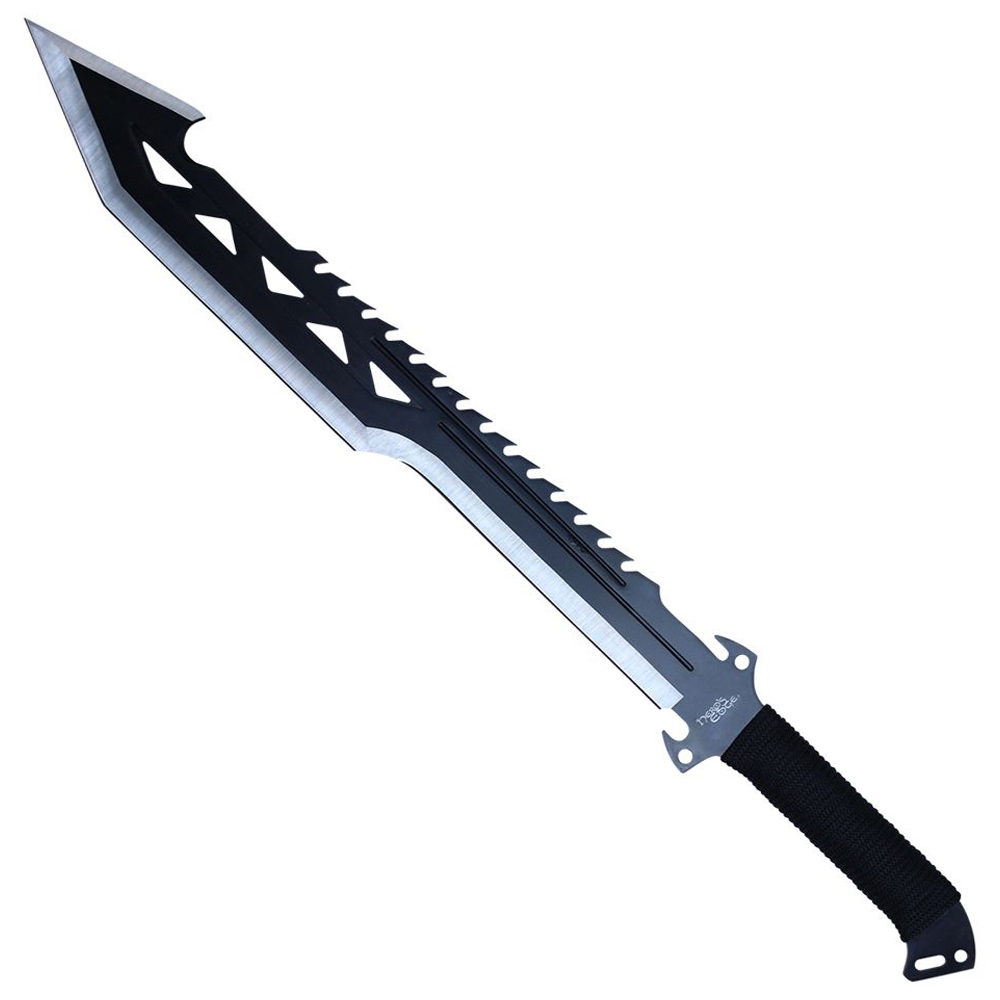 Tackle the wilderness with a machete at your side. You should make sure that you check out the Black Sawback Fantasy Machete. Made from stainless steel, this machete has a straight two-tone blade. The edges are silver-colored while the rest of the blade is black. It is wider along the half near the tip. The tip of the blade is the widest piece. Triangular cutouts adorn the wider half of the blade. There are two thin fullers along the narrower half of the blade. The spine has a sawback design from the wider half to the narrower half.