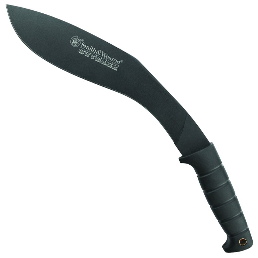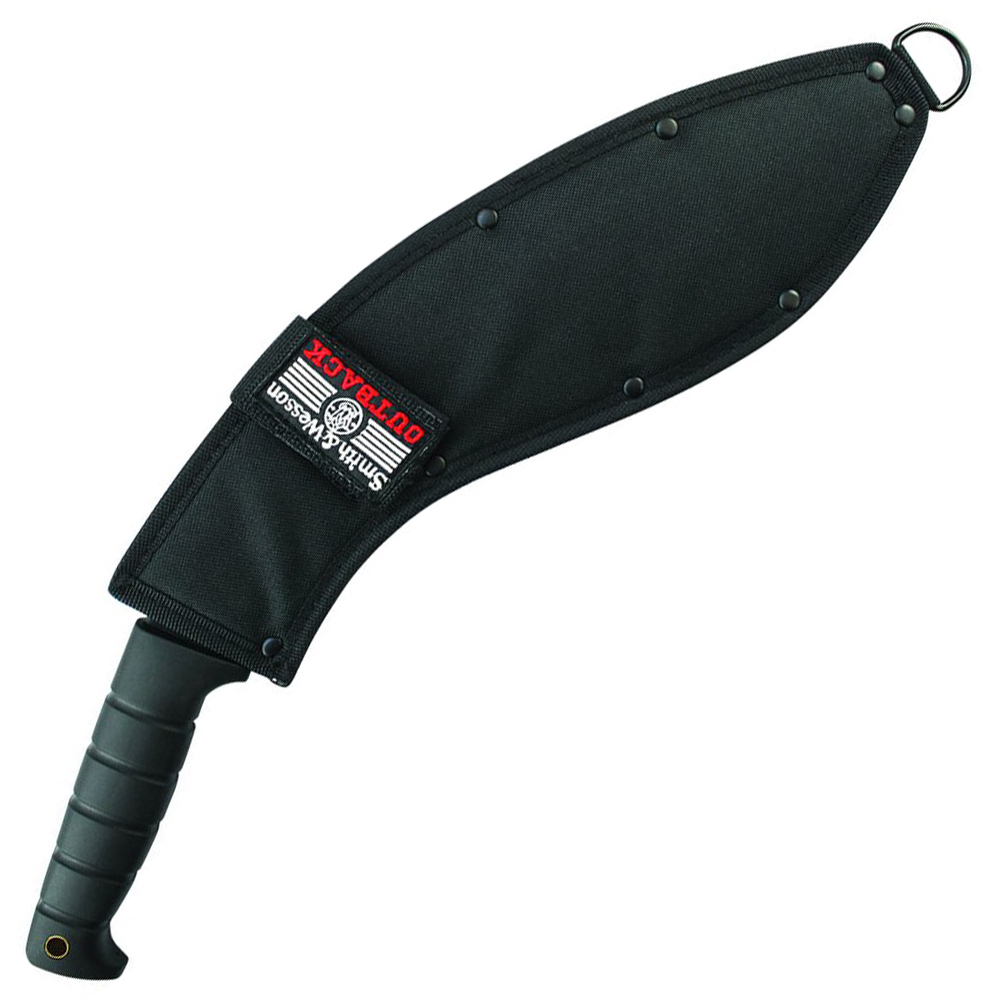 The Smith & Wesson Outback Kukri Full Tang Fixed Blade Knife is made with a black high carbon stainless-steel blade. Its deep grooved rubber wrapped handle comes with a lanyard hole and black polyester belt/shoulder strap sheath.