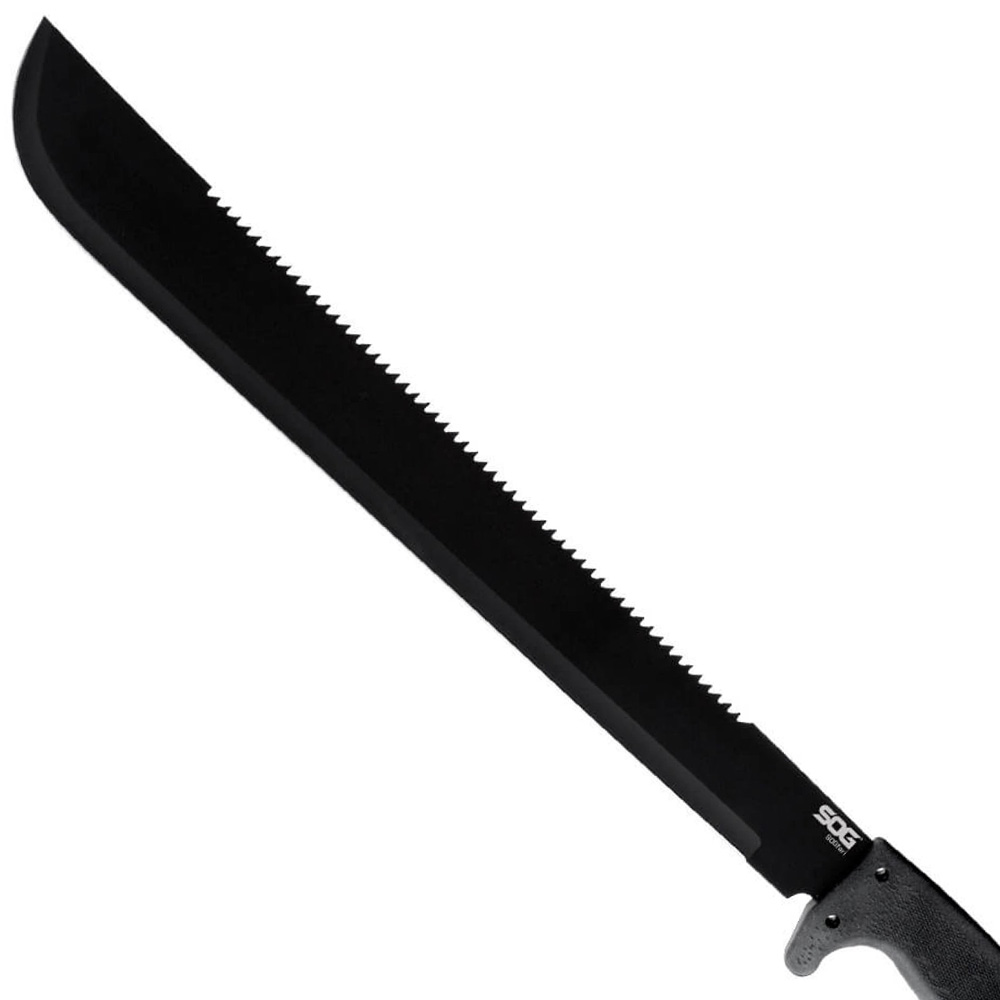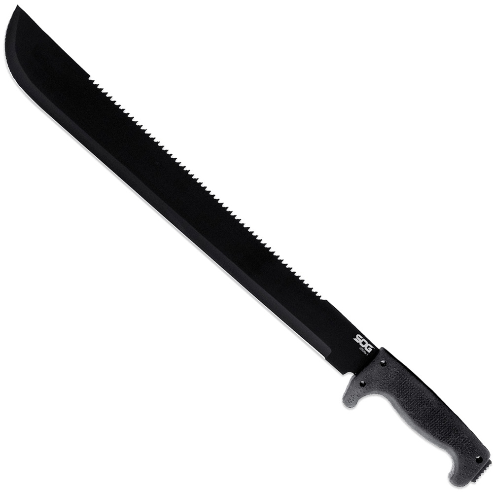 A machete which size will work for you. Machetes are one of the more useful edged tools in the world. They have cleared brush, and blazed trails, have chopped wood, made shelters, harvested crops, prepared meals, hunted and protected. Careful attention has been given to the SOGfari to make sure that the weight was right and the handles were comfortable for extended use. Whip them through the air and hear them sing. We've added a real working saw on the back of the blades with teeth that cut deep. Extended out of the back of the handle is a spiked tang for pounding and scraping. There are even holes in the handle to mount lanyards. SOGfari... the go to tool for survival, exploration and adventure!