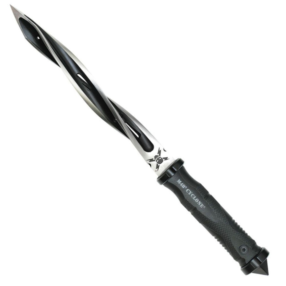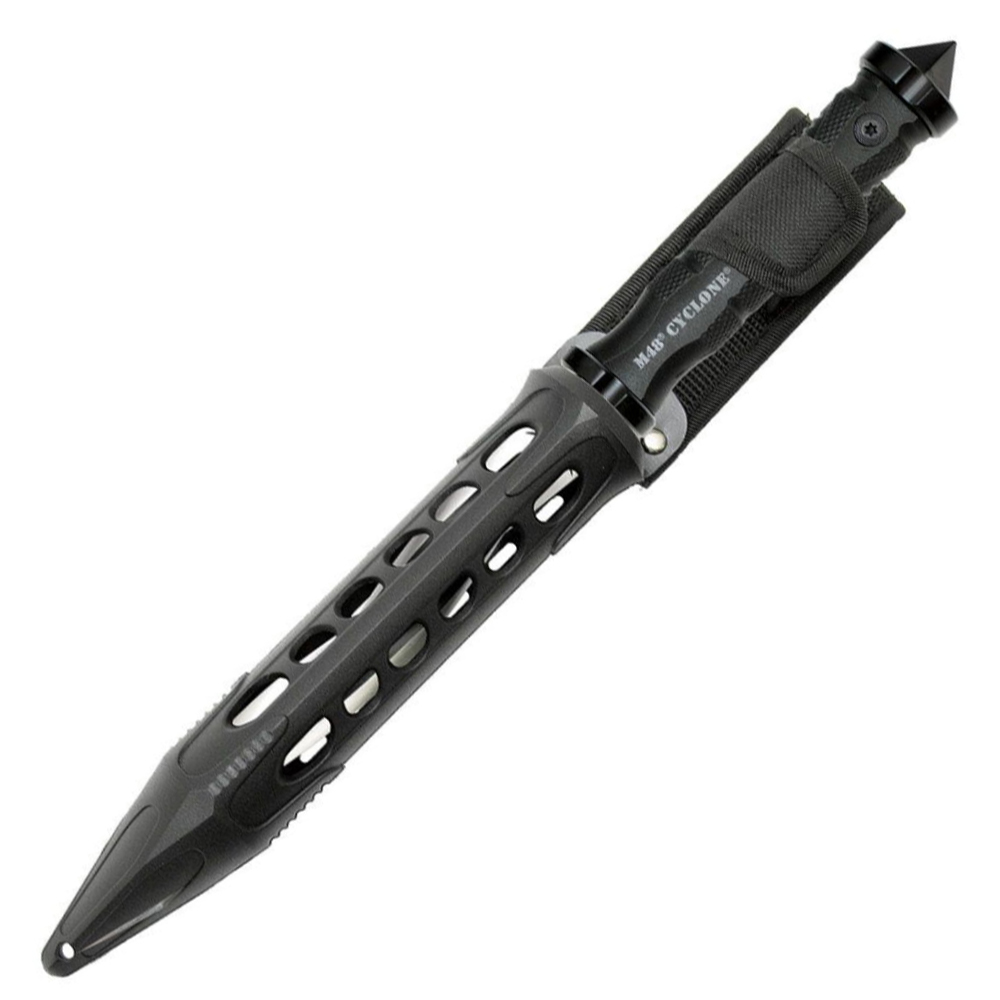 You have never seen anything that compares to United Cutlery’s new M48 Cyclone Fixed Blade Knife! The 8” cast 2Cr13 stainless steel blade has been crafted into a spiraling masterpiece of design, using temperatures up to 1,030 degrees, which gives it a 48HC. The three spiraling cutting edges come down to an incredibly sharp piercing point. As with all M48 knives, the glass-fiber-reinforced nylon handle gives you a strong and secure grip. The Cyclone also features a solid stainless steel hand guard and skull crusher pommel. The blade slides into a custom Vortec TPR belt sheath that fits like a glove and is virtually indestructible. The fixed blade is 13 1/2” in overall length.