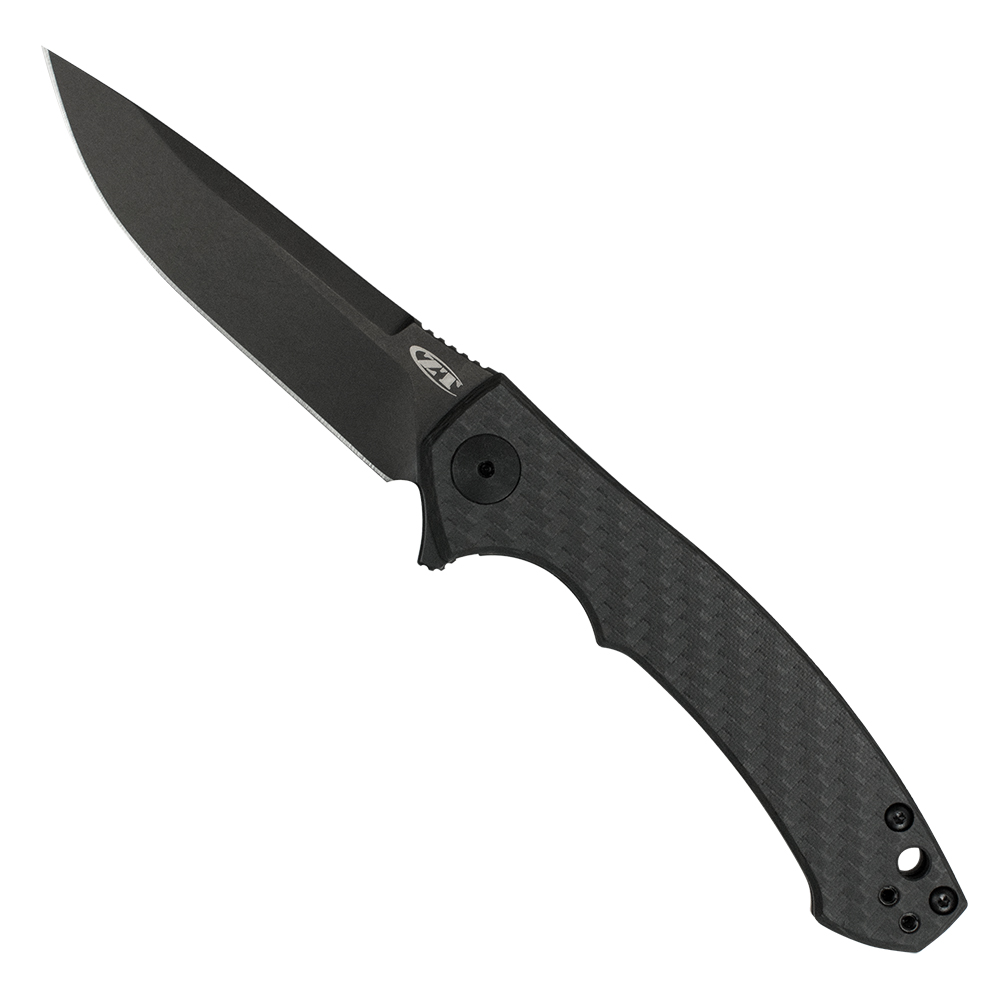 This sophisticated ZT-0450CF is a smaller option in the ZT family, yet offers a robust combination of durable, premium-quality materials. The blade steel is CPM-S35VN for exceptional toughness, wear resistance, and edge retention. The S35VN blade is DLC coated for matte-black good looks and enhanced performance. The front handle scale is carbon fiber, balancing the knife’s solid construction with lightweight convenience. The DLC-coated titanium back handle offers a secure frame lock—so you can always cut with confidence. As an extra visual touch, ZT has added two emerald-green anodized-aluminum tube spacers that are especially eye-catching, standing out against the black handle. The 0450CF takes advantage of ZT’s KVT ball-bearing system to enable smooth, easy opening for either left- or right-handed users. A left/right reversible pocketclip rounds out the 0452CF’s basic feature set.
